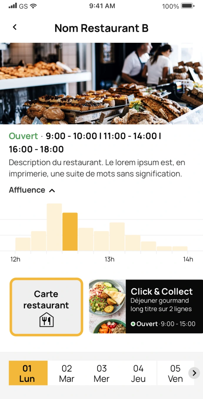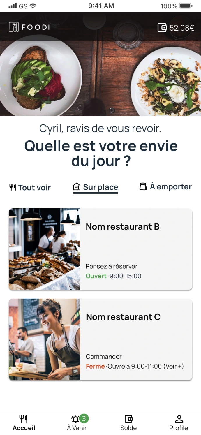 Choix du restaurant simplifié : Une sélection rapide du point de vente avec un filtre direct pour choisir entre "Sur place" ou "À emporter".