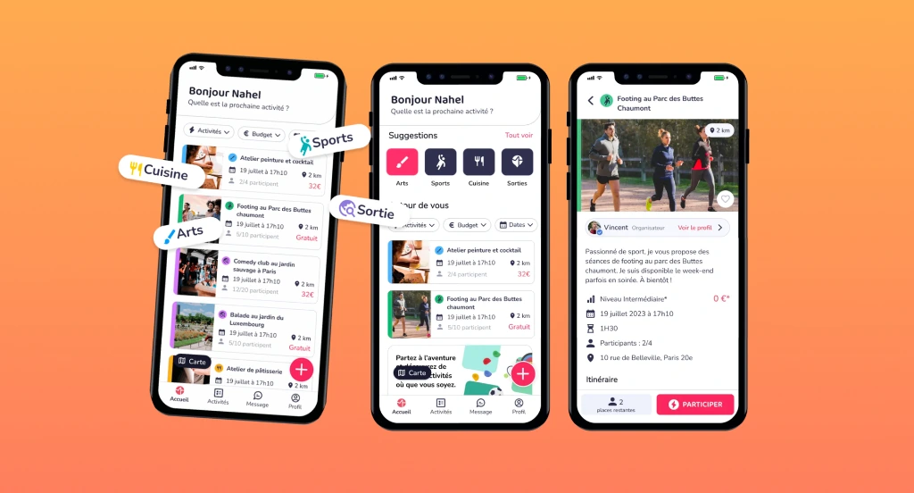 J'ai structuré l'interface autour de trois axes : mettre en avant les profils des organisateurs pour instaurer la confiance, simplifier la navigation pour passer de l'envie à l'action sans effort, et rendre la création d'activité accessible à n'importe quel passionné.